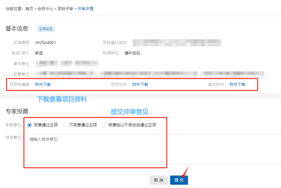查看項目資料后,進行立項論證、技術審查或報批評審投票——填寫評審意見——提交,完成評審。